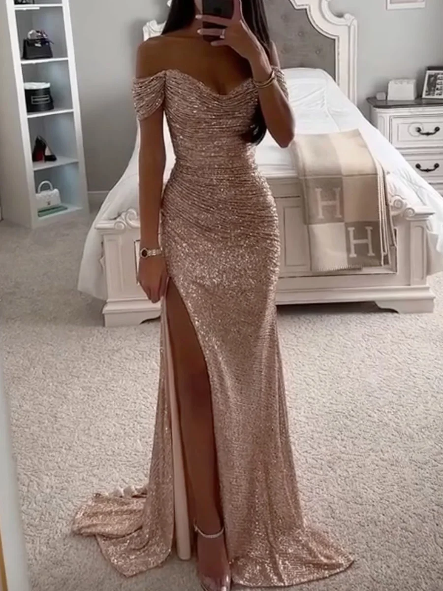 Shiny Sequinned One Shoulder Short Sleeves Split-Side Elegant Mermaid Maxi Dresses