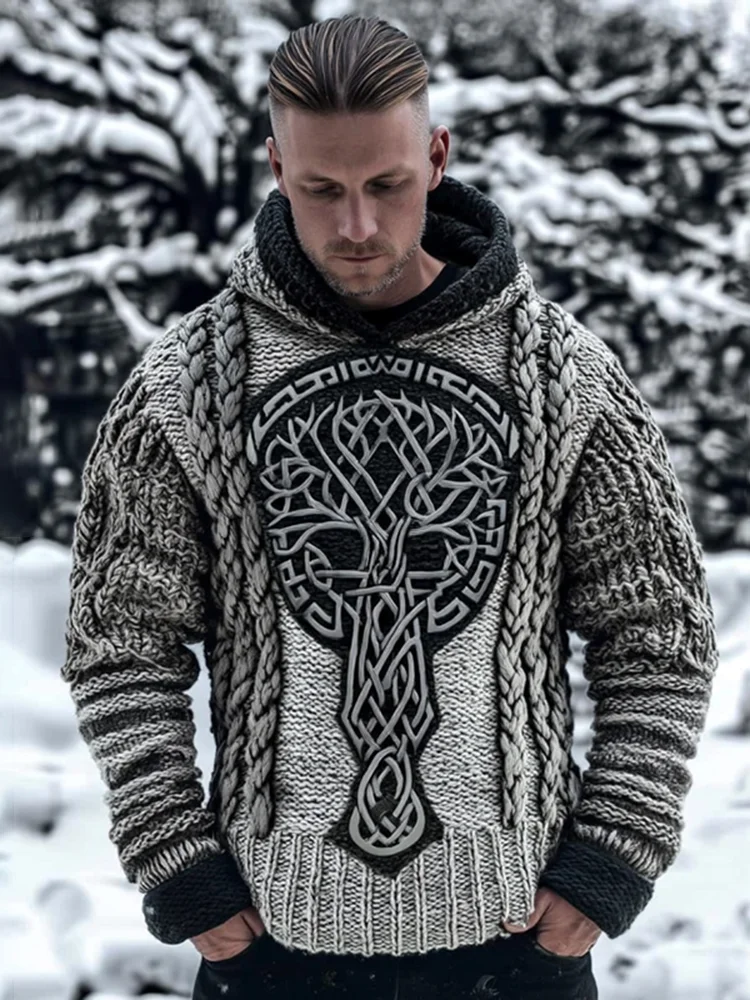 Men's Viking Tribal Jacquard Celtic With Tree Of Life Inspired Chunky Knit Hooded Sweater