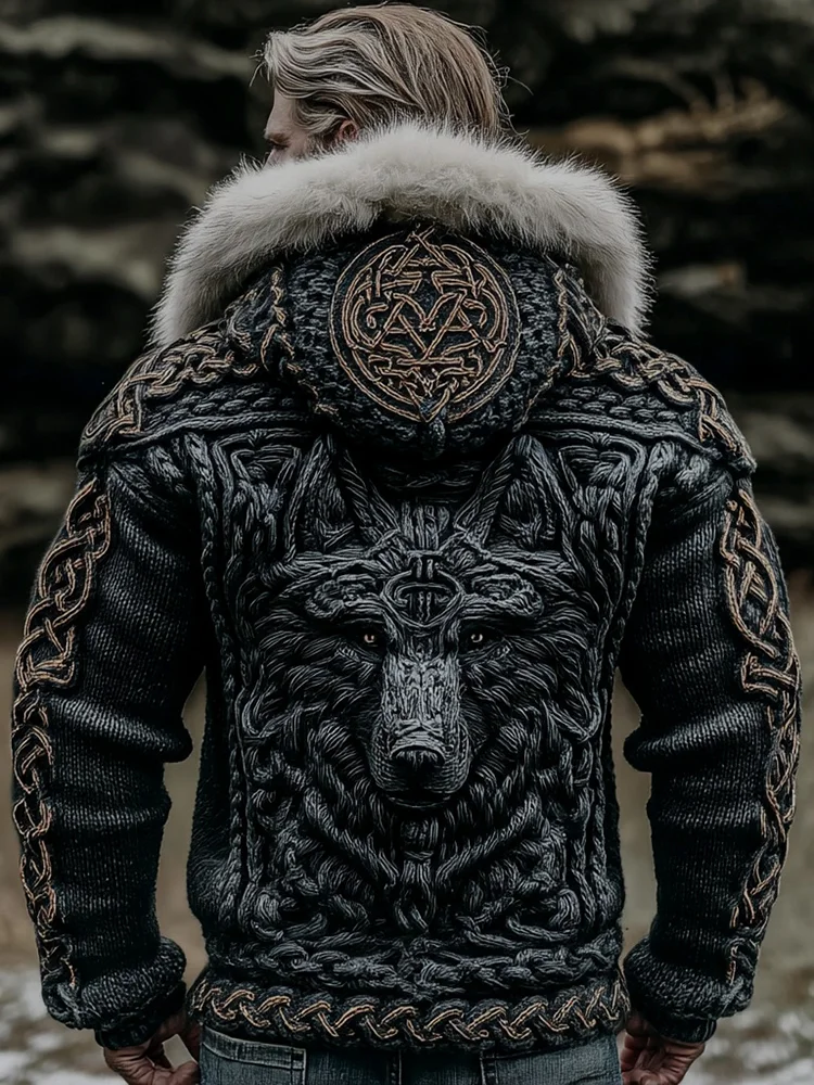 Men's Viking Wolf Celtic Knot Knit Fuzzy Hooded Zipper Cardigan