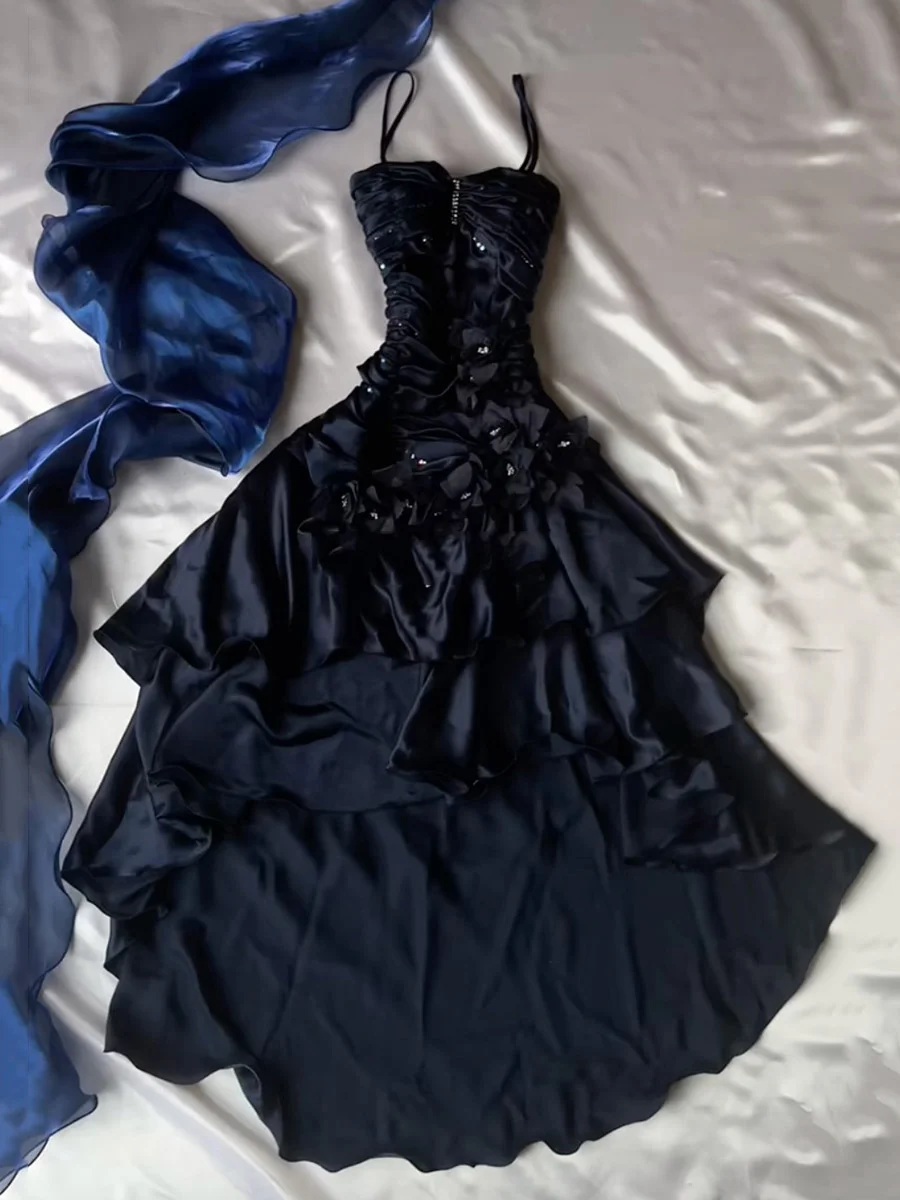 3D Flower Rhinestone Ruffled Sleeveless Spaghetti-Neck Satin Maxi Dresses Fairytale Drexss