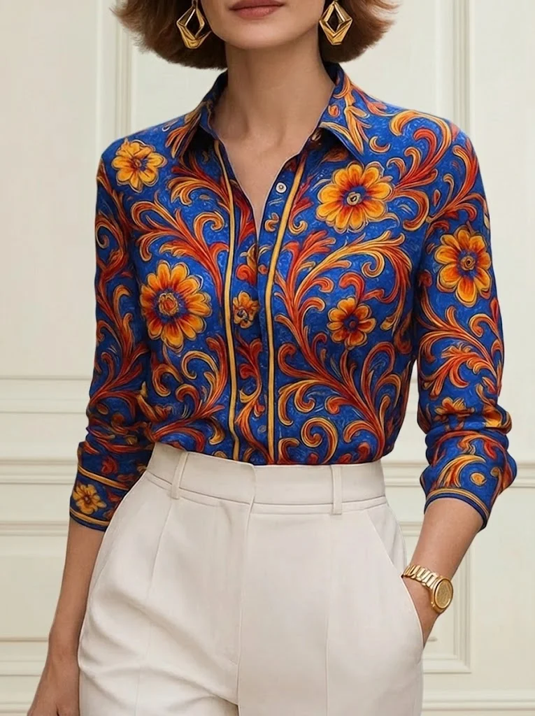Buttoned Flower Print Long Sleeves Lapel Blouses&Shirts Tops