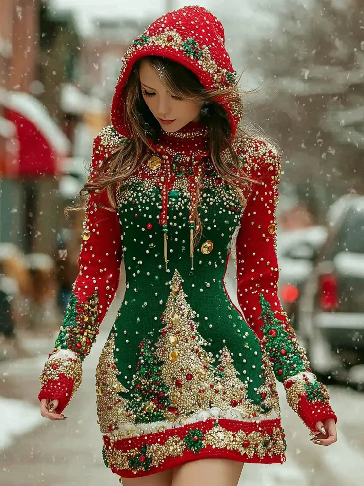 Elegant Christmas Tree Pattern Knitted Hooded Wool Dress