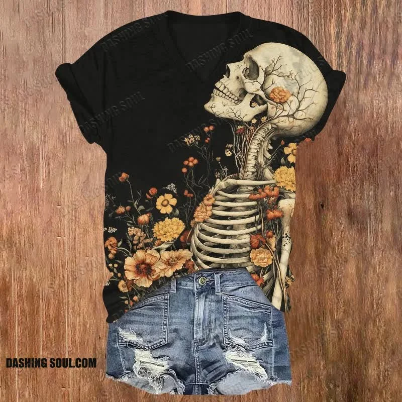 Floral Skull Halloween Print V-neck T-shirt