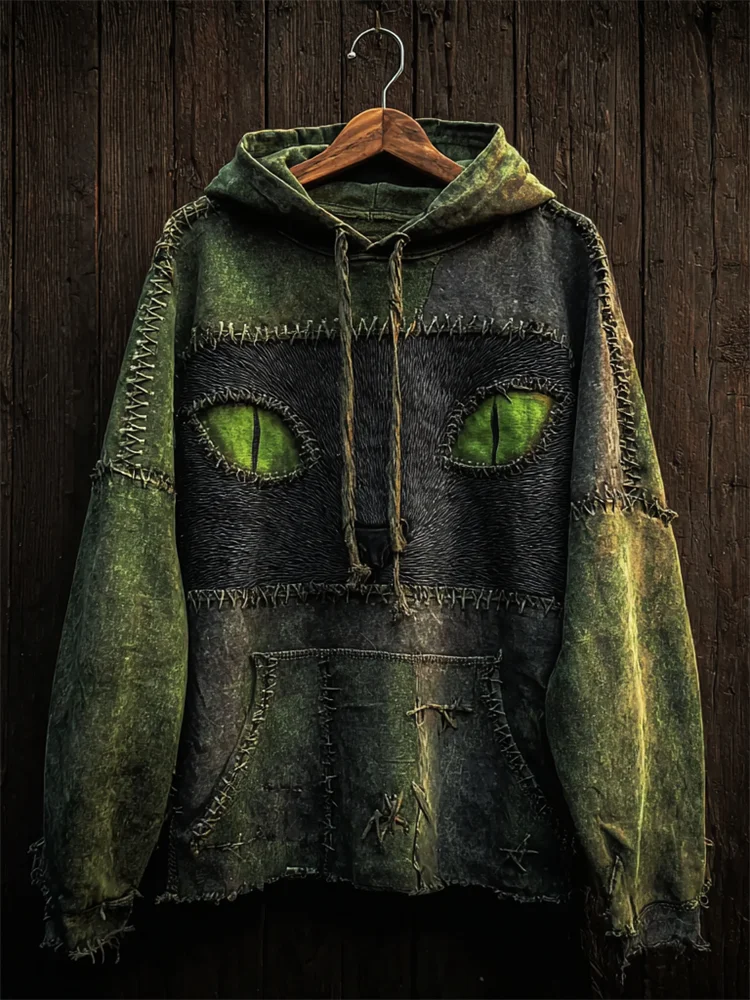 Halloween Black Cat Face Colorblock Patchwork Washed Hoodie