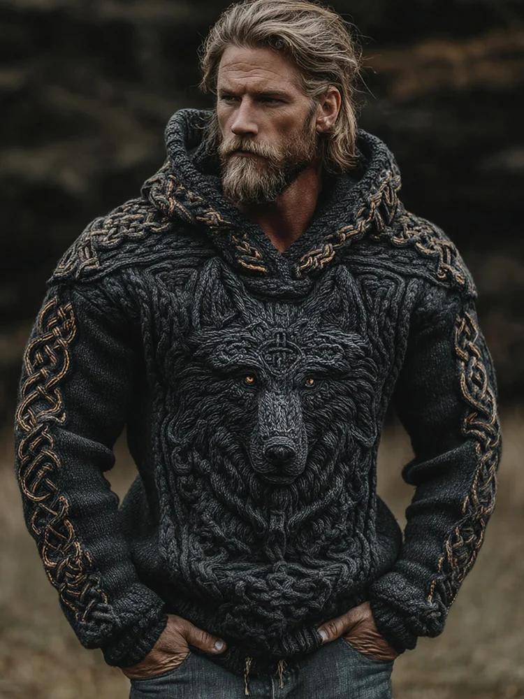 Men's Viking Wolf Celtic Knot Jacquard Knitted Hooded Sweater