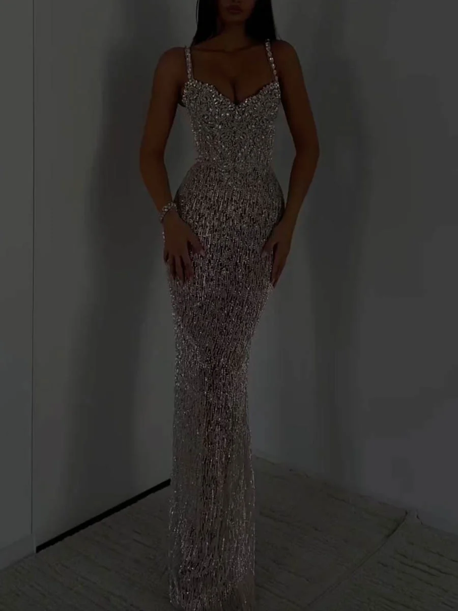 Shiny Rhinestone Spaghetti-Neck Sleeveless Tassled  Maxi Dresses Party Dresses