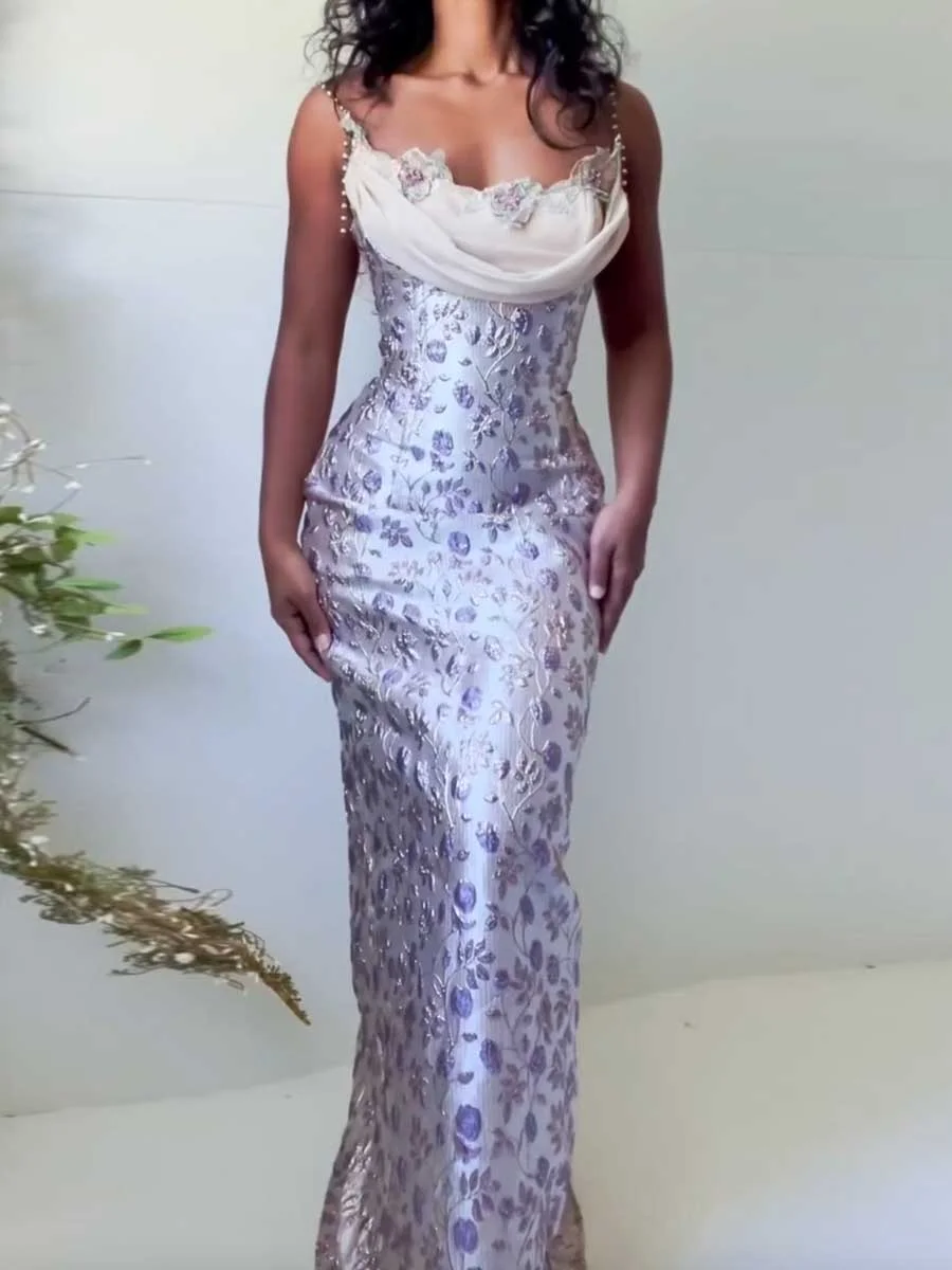 Shiny Sequinned Flower Embroidered Spaghetti-Neck Sleeveless Satin Maxi Dresses Fairytale Dress