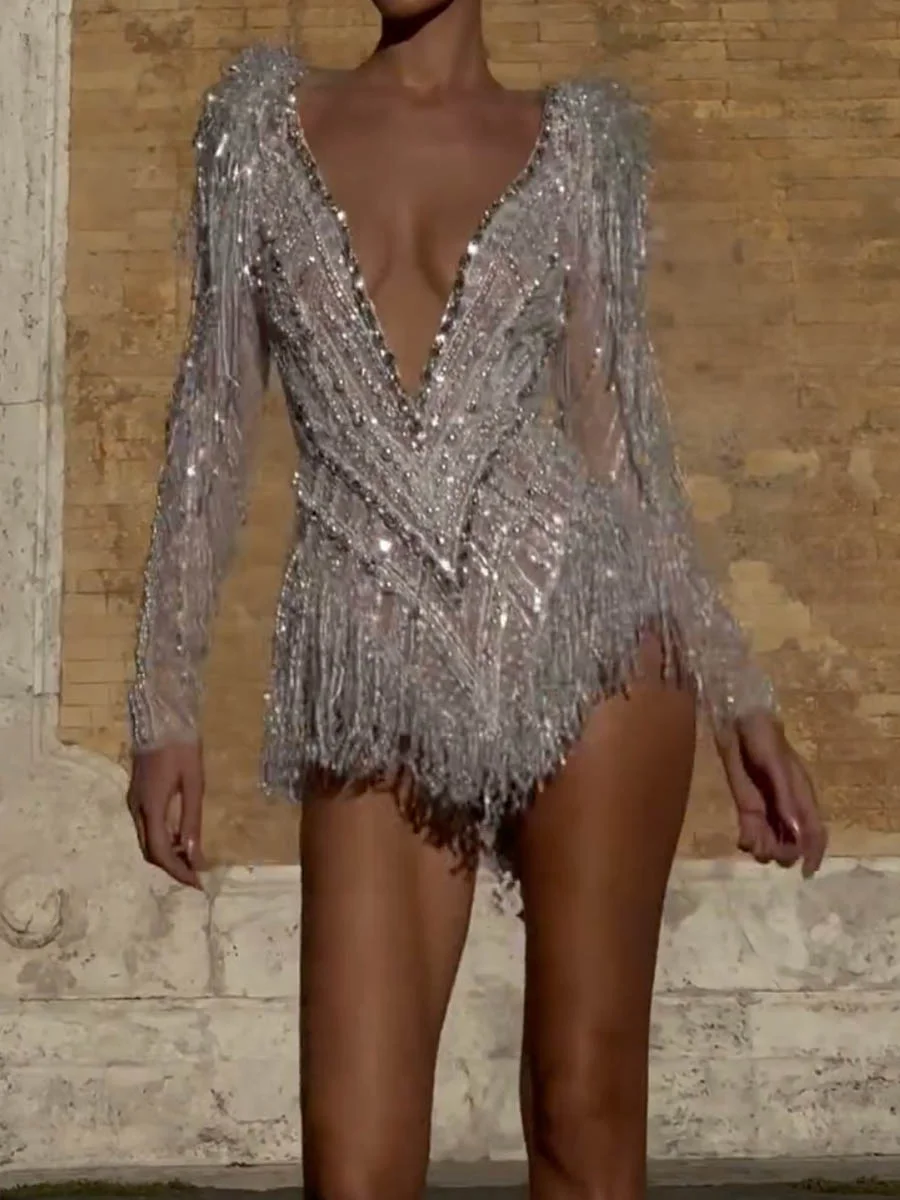 Shiny Sequinned Flower Long Sleeves Deep-V Neck Ruffled Mesh Mini Dresses Party Dresses