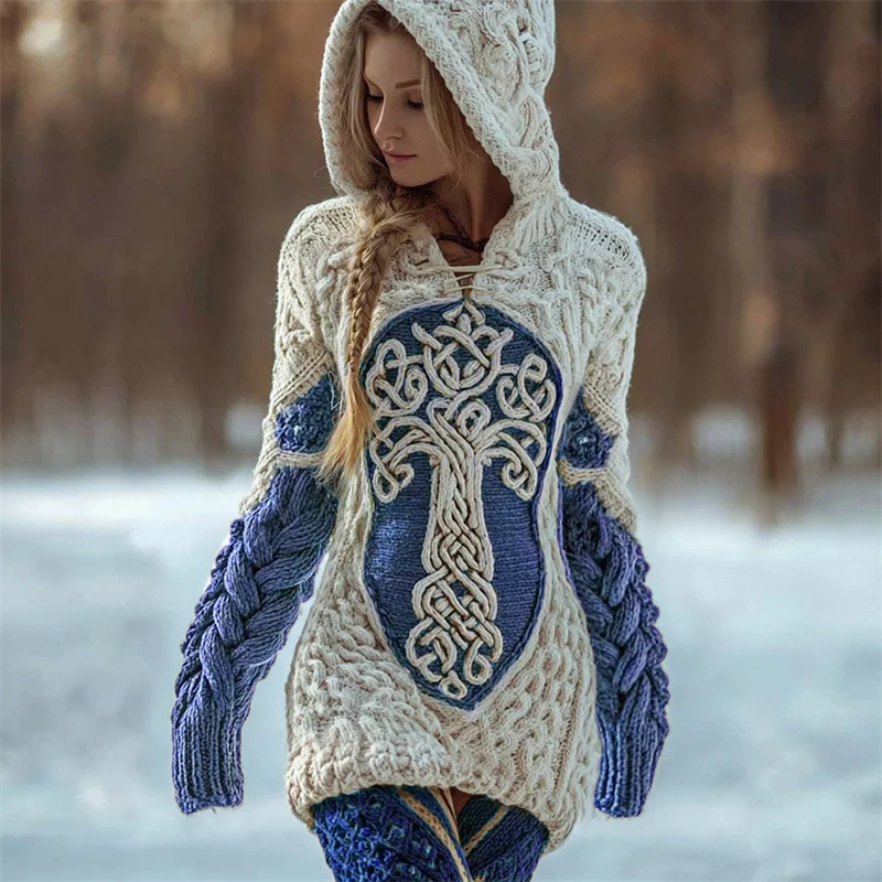 Viking Tree Of Life Celtic Contrast Cozy Chunky Hooded Sweater