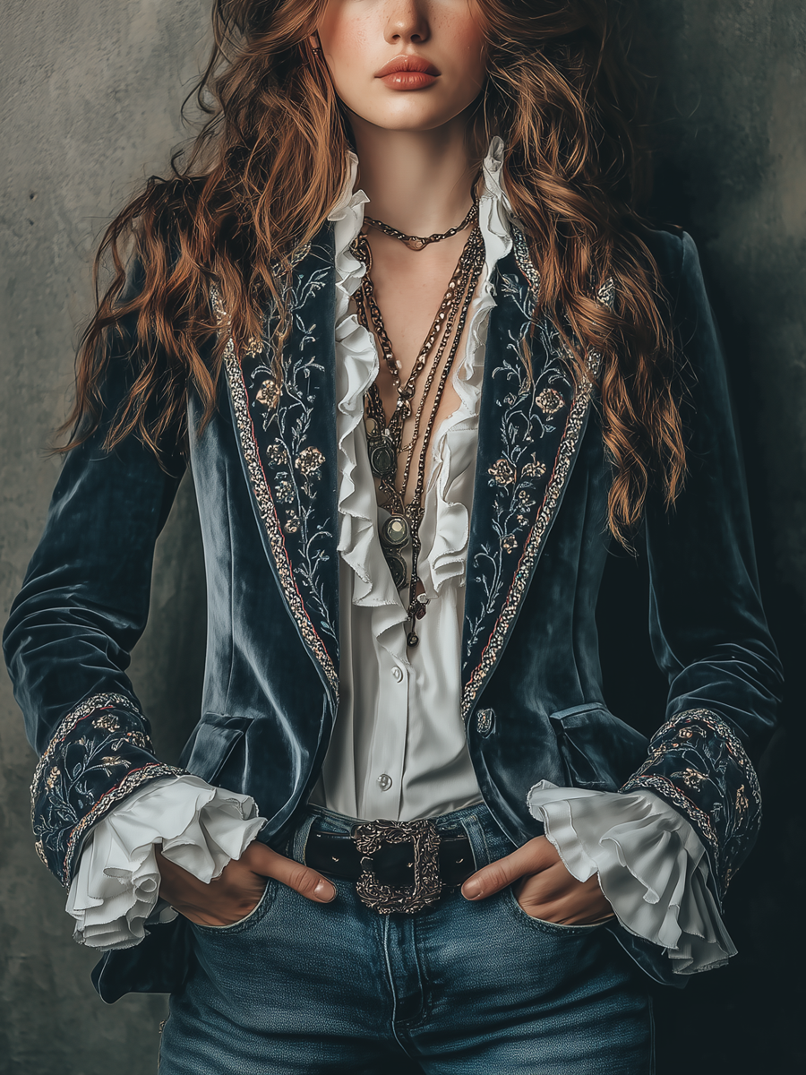 The Vintage Flower Embroidered Cuffs Polyester Velvet Blazer is a wardrobe essential that effortlessly combines vintage aesthetics with contemporary style. Its luxurious fabric and unique detailing make it an ideal choice for adding a touch of elegance and sophistication to your outfit.