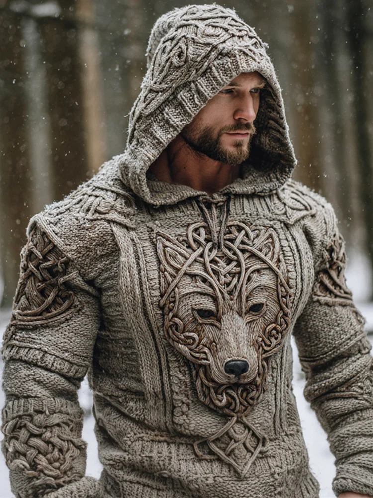 Vintage Viking Wolf Head Men's Chunky Knit Hooded Sweater