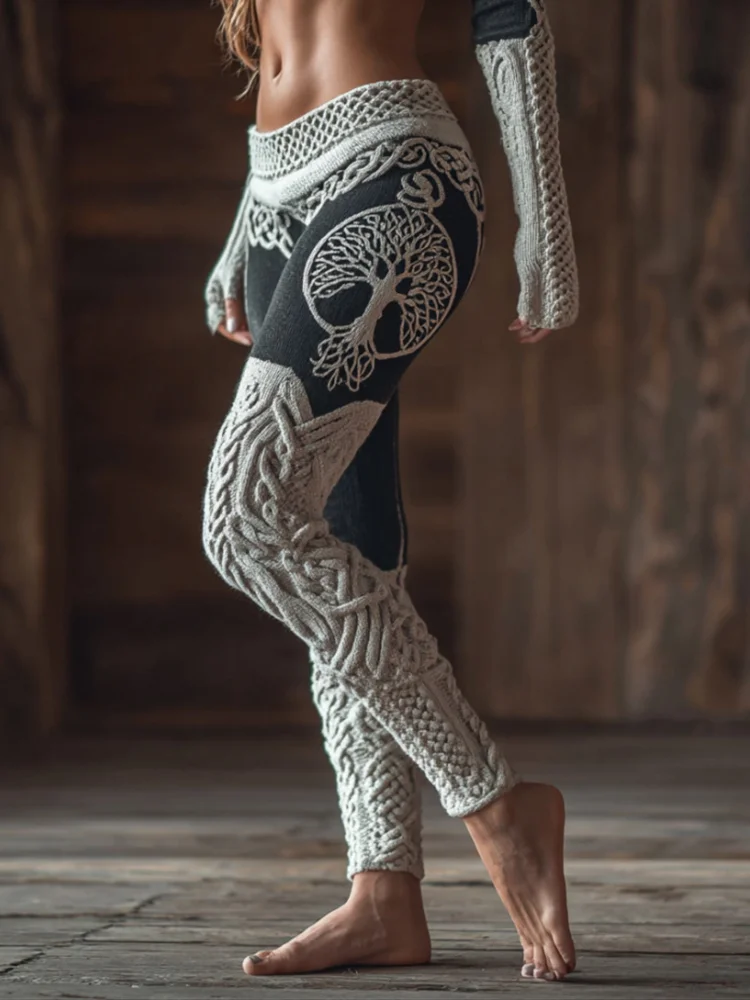 Women's Viking Style Tree Of Life Knot Black And White Contrasting Leggings